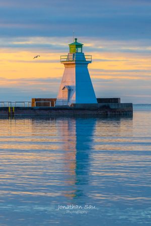 The lighthouse at Port Dover, Ontario basked in the warm morning sun, as a seagull flew by.