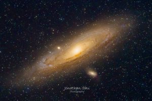 At a distance of 2.5 million lightyears, the Andromeda Galaxy is one of the closest neighbours of the Milky Way. It is also one of the furthest light sources visible to the unaided eye as a fuzzy grayish patch of light. Astrophotography allows Andromeda to be rendered in colour and great details, showing the dust lanes and blue outer regions of young, hot stars. Andromeda is estimated to contain one trillion stars. Two satellite galaxies, M32 (above Andromeda) and M110 (below) is also seen in this image. Andromeda and Milky Way are expected to collide and merge in about 4 to 5 billion years to form a giant single galaxy.