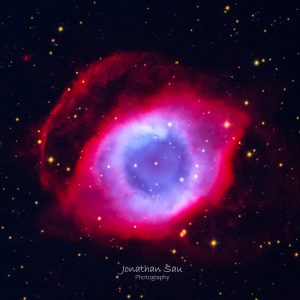 Planetary nebulae, despite the name, have nothing to do with planets. They are formed at the end of life of a low to medium mass star, when all its fuel for nuclear fusion has been exhausted. The material in the outer layer of the star is ejected into space, while the core collapses into a white dwarf. The white dwarf continues to emit intense radiation, ionizing the ejected material and causing it to glow – hydrogen glows in red, while oxygen glows in blue-green.