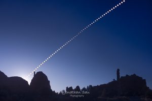 This composite image of the October 14, 2023 annular solar eclipse was captured from Kodachrome Basin State Park in Utah. The landscape was taken just before the rising sun cleared the hoodoo, and then 58 exposures of the sun (captured with solar filter), taken 4 minutes apart, covering the entire duration of the eclipse, were added. As with all my astro landscape images, all exposures were taken from the same camera position, using the same lens, therefore accurately reflecting the actual unfolding scene. An annular solar eclipse happens when the moon goes between the sun and Earth while near its apogee (furthest point from Earth in its elliptical orbit), and therefore does not complete cover the sun. While not as spectacular as a total solar eclipse, the “ring of fire” is still a sight to behold.