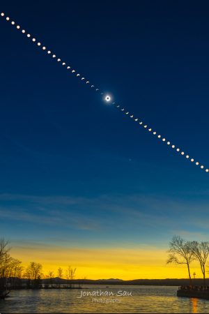 A composite of the total solar eclipse on April 8, 2024, photographed at Lake Magog, Quebec, Canada. This composite covers 3.5 hours duration in total, including the entirety of the eclipse, with individual solar images 5-6 minutes apart. All elements of the image were taken at 28 mm focal length from the same camera position, therefore reflecting their true relative sizes and positions.
