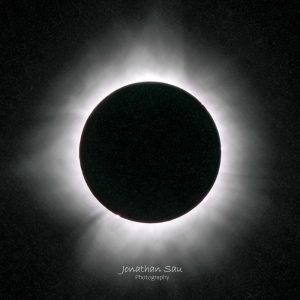 2: Totality, showing the corona which can only be seen during a total eclipse. The corona is the outer layer of the sun’s atmosphere and extends millions of kilometres from the sun, with temperature reaching a million degrees Celsius.