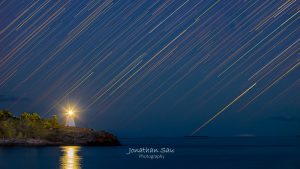 “Killarney Star Rise” captures the experience of watching stars rising behind the picturesque Killarney Lighthouse, as evening twilight turns into darkness. A total of 135 separate exposures were used to compress this 80-minute experience into a single image. All individual exposures were taken with the same camera position and focal length to reflect the true trajectory of the rising stars in relation to the landscape.