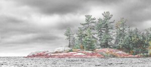 “Standing Tall” captures the views around the Chikanishing River and Collins Inlet area. Our kayak gave us great vantage points from the water, unencumbered by land. This image started out as a regular photograph. Through creative digital edits, I worked on colours and texture, striving to bring out the feeling Killarney brings to me – tranquility, and an appreciation of the untamed beauty, sculpted by forces of nature.