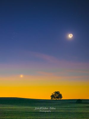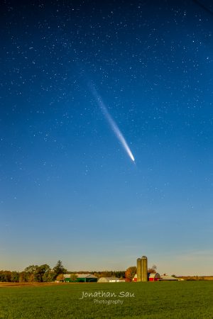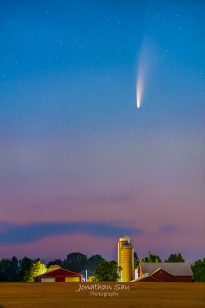 This image was taken on July 10, 2020. Neowise was a bright magnitude 2 comet at the time with a beautiful long tail. It had no problem outshining the early morning twilight and the 75% moon, which provided the warm illumination for the farmscape. Neowise is now on its way out of the solar system and will not return for another 7000 years.