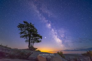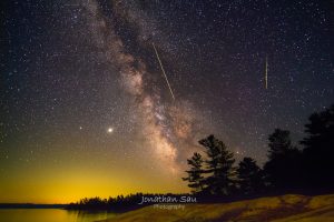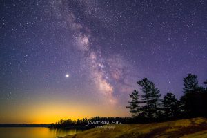 Milky Way, our home galaxy, can be seen year-round in the night sky. However, the most spectacular view can be found in the summer months, when the core of the Milky Way can be seen in the southern sky after dusk, as in this quintessentially Canadian nightscape. The summer Milky Way reveals itself during the evening twilight, as the sky darkens into a deep blue, behind the Georgian Bay landscape. The two brightest objects left of the Milky Way core are the gas giants Jupiter and Saturn, both near opposition and shining brightly.