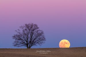 Capturing this image requires paying attention to the alignment of time and space. This shot was taken on a clear day when sunset and moonrise were only a few minutes apart, and when the rising moon lined up with the tree. There are often only one of two days a year when all the conditions are aligned.