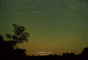 The Perseid Meteor Shower is formed when Earth travels through the debris from the comet Swift-Tuttle. The meteor shower can be seen annually from mid July to late August, and peaks around August 11 to 13 where 100 or more meteors can be seen per hour under ideal conditions. Dark skies are needed for the best view, as in Manitoulin Island, Ontario where this image was taken. This image captures the Perseids within a span of 3.5 hours. All Perseids appear to originate from a point, the radiant, in the Perseus constellation off to the right of the image. The airglow, formed as air molecules in the upper atmosphere were excited by solar radiation, was very faint to the eyes, but showed up as a green and red glow throughout the sky under long exposure.