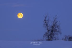 The February full moon illuminates the snowy field where a lone tree stands in solitude.