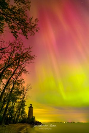 The aurora activities on May 10-11, 2024, was truly a great northern lights show. A series of violent explosions of a sun spot a few days earlier created the ideal condition for a Kp 8-9 storm (9 being the highest on the Kp scale) that lasted over 24 hours. Millions of people around the globe, including tropical areas like Puerto Rico and Africa, were able to see the aurora with unaided eyes. This image was taken on Pelee Island, the southernmost inhabited land in Canada. Even at such southerly latitude (42 degrees), aurora filled the sky.