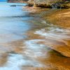 A section of the sandstone shoreline at the Pictured Rock National Lakeshore in Lake Superior. Lighting was lovely this day with the sun making occasional appearances behind dramatic clouds. A gentle wave made a splash, adding some extra texture to the intricate layers of sandstone.