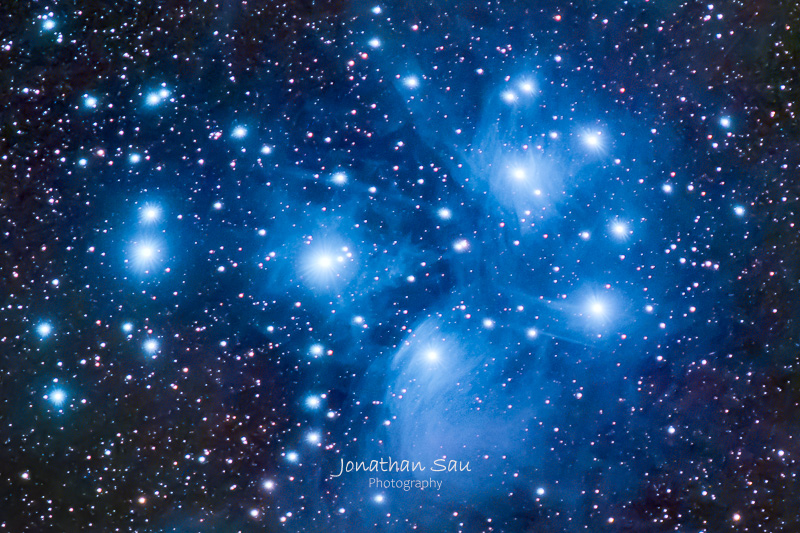 The Pleiades are traveling through an area in space rich in interstellar dust. In astrophotography, the Pleiades are surrounded by blue nebulosity with intricate texture. The blue colour is due to dust preferentially reflecting the blue light from the stars, the same physics that make the sky blue on Earth.